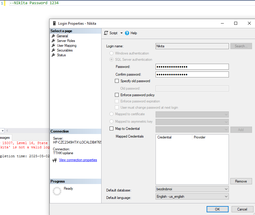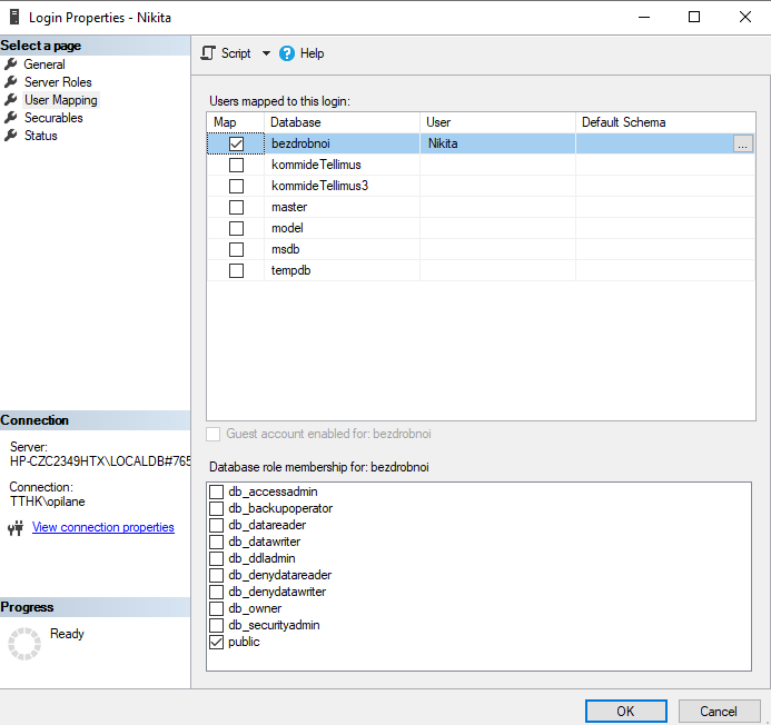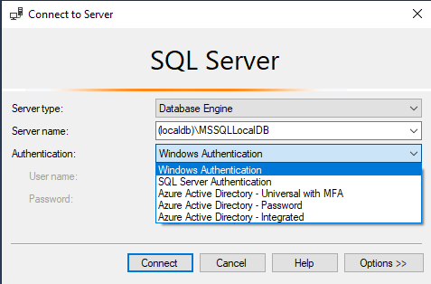 -(localdb)\MSSQLLocalDB ja WIN auth — – admin õigused SQL Server